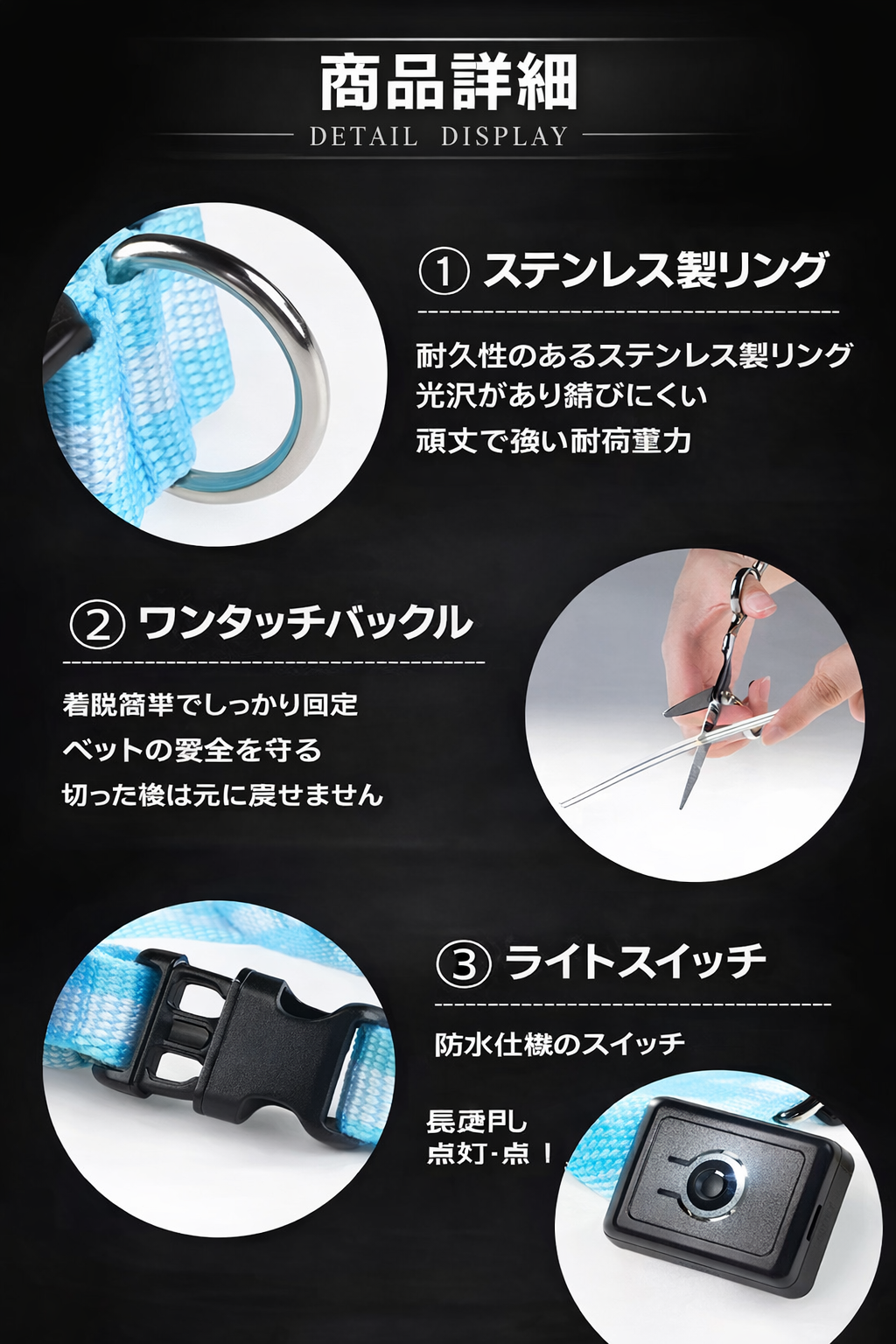 Hikari Collar™は、USB充電式のLEDライト付き首輪 。夜間でも愛犬の存在をやさしく知らせ、飼い主さまが安心してお散歩できるよう、